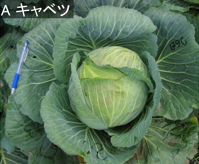キャベツ×ケールF1雑種は一応結球しましたが葉どうしの重なりが弱く、やや尖った形状になりました(図E)。