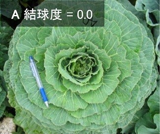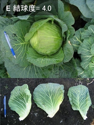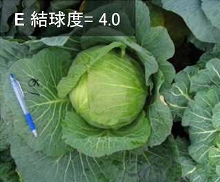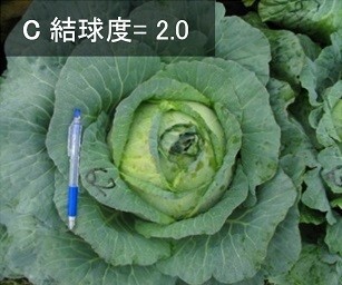0:結球していない、1:中心部のみ小さく結球、2:弱く結球し球の頭が開いている、3:球の頭の重なりが不完全な結球、4:完全結球とし、それぞれの評点の中間的なものを0.5、1.5、2.5、3.5とする9段階で評価してみました(下の写真)。