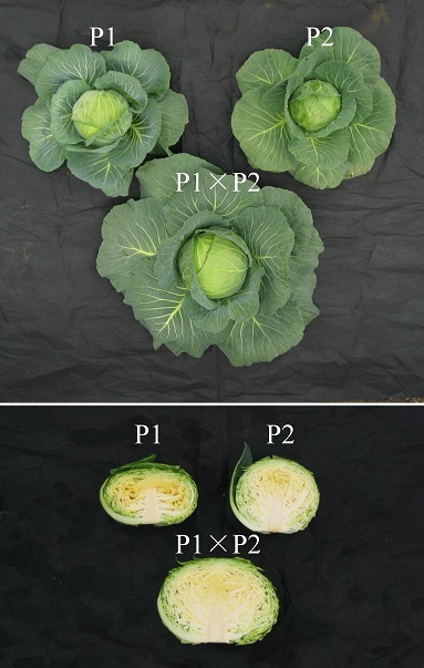 写真はあるキャベツF1ハイブリッド品種の雑種強勢の例です。親系統P1とP2の雑種(P1×P2)は雑種強勢で大きく育ちます。