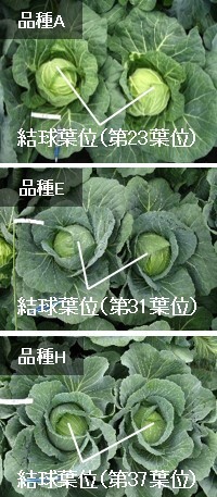 写真は早晩性の異なる3F1品種(A、E、H)の結球葉位の差です。早生の品種Aは結球葉位が第23葉位と低く(外葉の枚数が少ない)、熟期の遅い品種ほど結球葉位が高い(外葉の枚数が多い)ことが分かります。