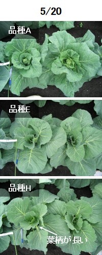 5月20日の様子です。早生の品種Aは結球が始まったように見えます。一方中間の品種Eや晩生の品種Hはまだ結球が始まっていません。加えて晩生の品種Hは品種AやEより葉柄が長いことが分かります。