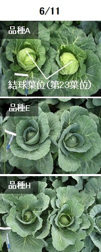 6月11日の様子です。品種Aは収穫サイズに達しました。結球葉位は第23葉位でした。一方品種EやHは結球が始まったばかりです。