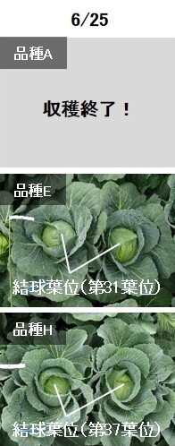 6月25日の様子です。中間の品種Eが収穫サイズに達しました。結球葉位は第31葉位でした。品種Hはもう少し時間がかかりそうです。なお品種Hの結球葉位は第37葉位でした。
