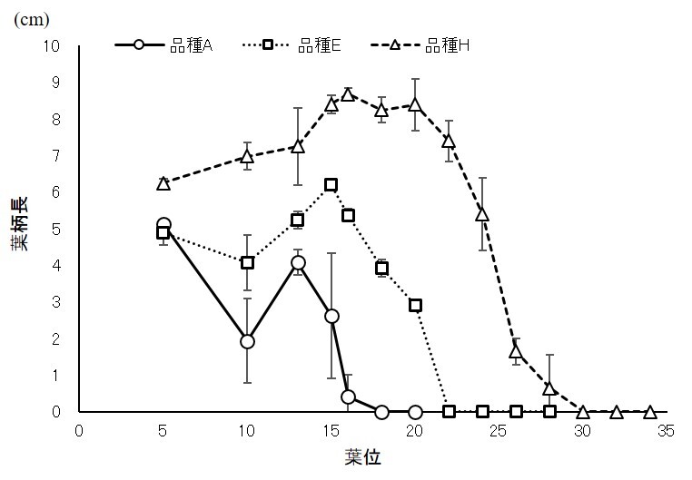 最も低い葉位で結球した品種Aは第16葉位で葉柄が1cm未満となり、第18葉位で確認出来なくなりました。中間の品種Eは第22葉位、晩生の品種Hは第30葉位で確認できなくなりました。