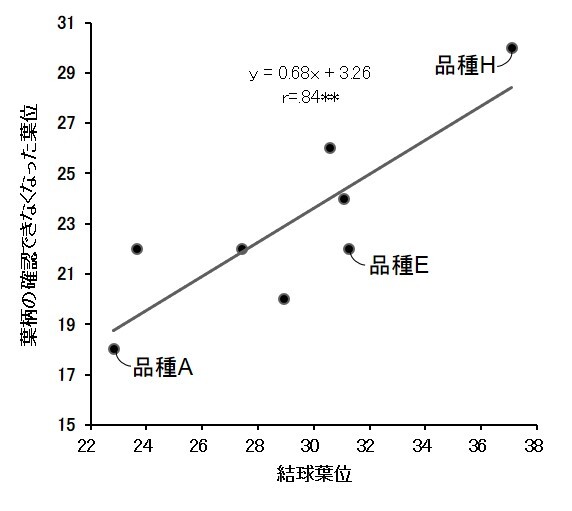 図は結球葉位と葉柄の確認できなくなった葉位の関係を示す相関図です。