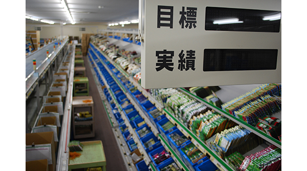 作業の流れに滞りを生じさせないためには、それぞれの作業者の仕事量を均等にする必要があります。どの棚のどの位置にどの商品を置くか、商品棚への配置の仕方は、ピッキングラインを効率よく動かす上で最も重要なポイントです。一つでも多く荷造りができるよう、熟練社員が経験を踏まえて発送地域や季節に応じて棚割りを変更します。
