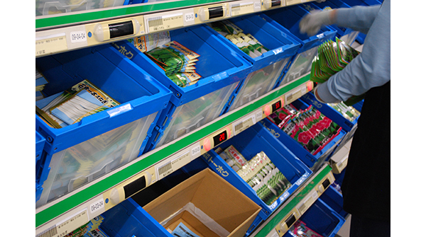 その日に発送予定のお客様分の荷物を完成させるためには、わずかの時間ロスも許されません。段ボールの流れをスムーズにしてピッキング処理能力を上げるために、様々な工夫がなされています。例えばその日に必要となる商品を充分量商品棚へ供給しておくことは基本です。