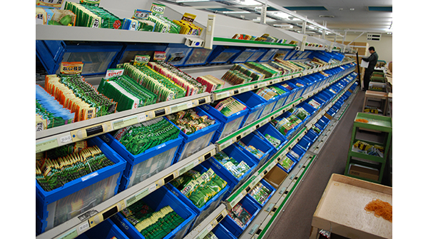 トーホクでは早くからデジタルピッキングシステムを取り入れてきました。発注内容がコンピューターに打ち込まれていて、そのデータをもとに商品を揃えていくのですが、取扱商品が直線的な棚に並んでいる横を出荷用の段ボール箱が流れて行き、必要商品を必要数だけ入れるように指示が出るようになっているシステムです。
